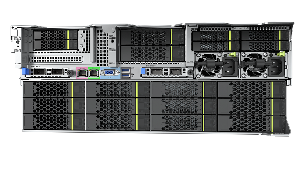 Компактный 2U форм-фактор с гибким дизайном шасси позволяет установить большое количество серверов в одной стойке высотой 42U, обеспечивая высокую плотность размещения оборудования. Модульная архитектура позволяет адаптировать сервер под конкретные требования: от минимальной конфигурации (один процессор, 8 ГБ памяти) до максимальной (два процессора, 8 ТБ памяти DDR5, 34 NVMe SSD).